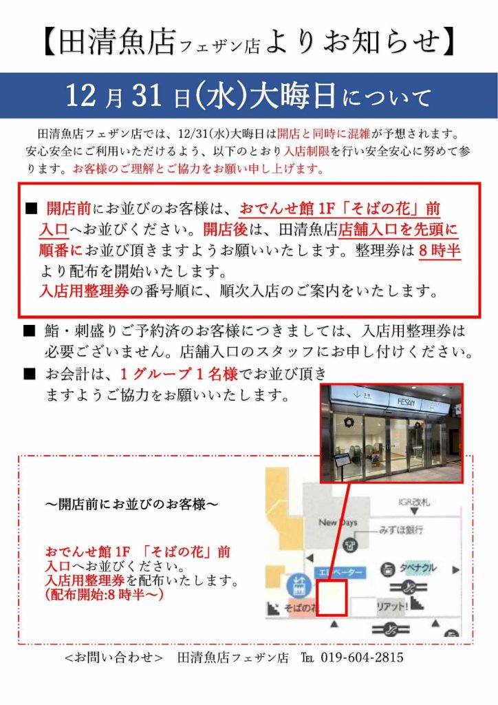 お知らせ 2025年12月9日 田清魚店フェザン店から「12/31大晦日の営業について」のお知らせ 田清魚店フェザン店では12月31日大晦日は開店と同時に混雑が予想されます。安心安全にご利用頂けるよう入店制限を行い安全安心に努めて参ります。お客様のご理解とご協力をお願いいたします。詳しくは下記「入店制限のお知らせ」よりご確認ください。 PDFを見る››